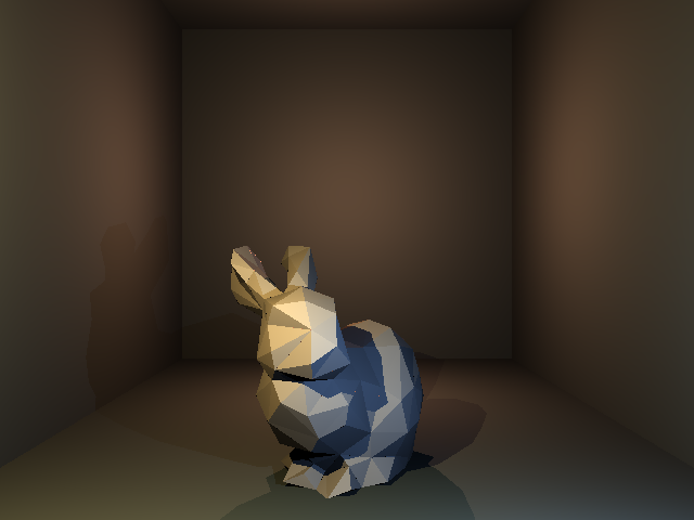 The second part I struggled at is one that I am really proud of how it turned out in the end. Having just made simple triangles (like in the screenshot above), our next task was to render out the Stanford bunny. My first thought was to make the mesh consist of Triangle instances, read from the obj file. This quickly proved to be less than ideal, as my mesh wasn’t rendering correctly. Someone then noted that this way of doing caused a lot more memory to be used, as I was storing every vertex more than once. So, I simply stored all vertices and indices in vectors, and looped over them. This allowed the TriangleMesh class to be independent from the Triangle class, and to allow code to be easily shared between both classes, without duplicating it, I put the shared code into a separate namespace, and call the namespace function in both classes.